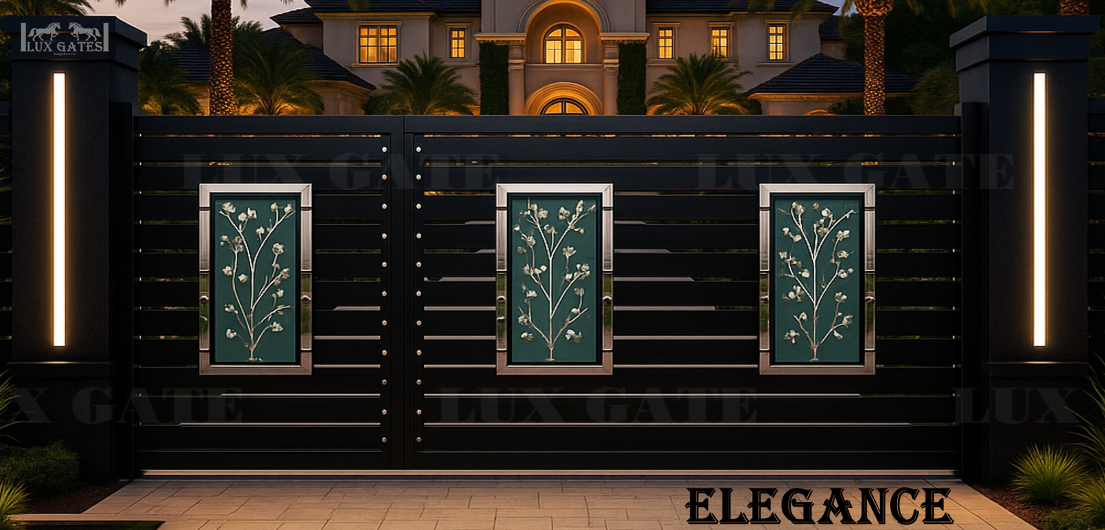 Behold, a design that captivates with its refined beauty. The sleek, dark lines of the gate are gracefully punctuated by illuminated panels, each adorned with an exquisite, nature-inspired motif. These delicate details, framed with polished precision, invite admiration and speak to a home where every element is carefully curated for both aesthetic pleasure and practical excellence.