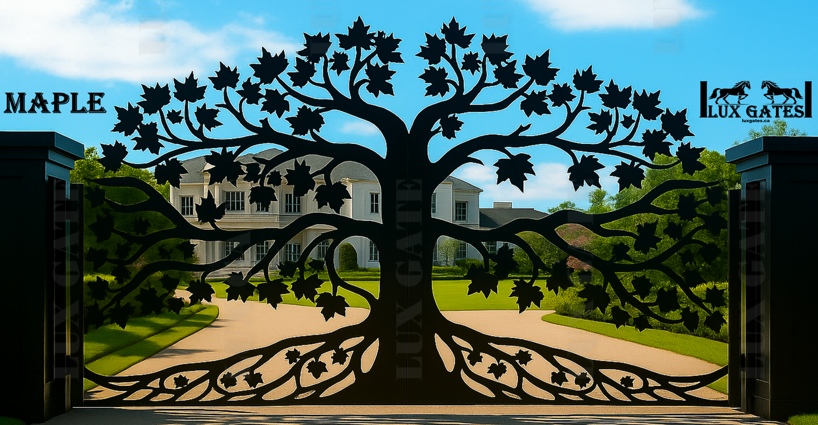 The Maple Gate is a stunning tribute to nature’s strength and beauty, capturing the timeless silhouette of a flourishing maple tree. Its sweeping branches and intricate leaves create a striking, organic pattern that extends across the entrance, blending artistry with symbolism. The deep roots at the base flow seamlessly into the design, grounding the gate in a sense of heritage and stability. As an emblem of Canadian identity and natural elegance, the Maple Gate offers more than an entryway—it offers a statement of pride, growth, and enduring grace.