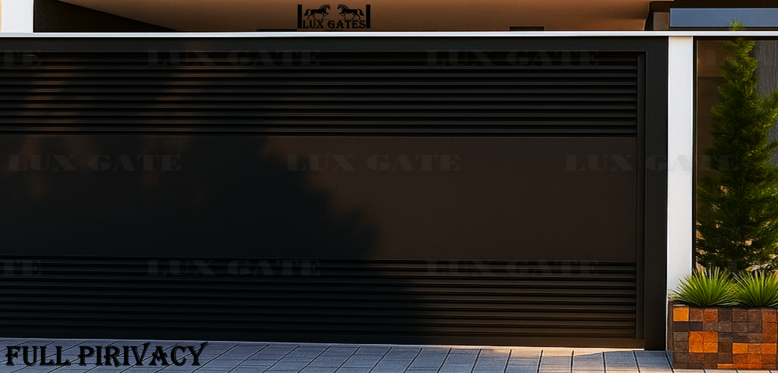This sleek black gate features horizontal slatted sections at the top and bottom, framing a smooth central panel for a modern, minimalist look. Set within a crisp white frame.